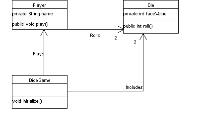 Also, notice that the class diagram shows that the DiceGame includes the dice. How does the player get visibility to the dice so that he may roll them? We went and added the dice as a parameter to the play method to provide this visibility. And notice that the feedback from the game is not really defined. Should the Player feed the result back to the game to inform it that he won? What's to keep the Player from bending the rules? How else could the player play the game? If we want to hide the implementation details of the game, where do the rules belong? Attempting to get a little better encapsulation to solve the problems listed above, we put the play method on the DiceGame. In this way the game can encapsulate the rules. See the result in Figures 3 and 4 and Solution 2 below. ![]() Figure 3: Class Diagram - OBD