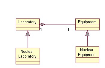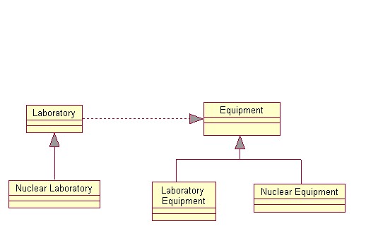 | 45. Consider the mirror hierarchy shown in the diagram. In this case, the type of equipment contained in a laboratory reflects the type of laboratory. According to the Liskov's Substitution Principle, you should be able to substitute instances of a subclass for its superclass, which indicates that you should be able to use nuclear equipment wherever you can use equipment. According to the figure, you can use equipment in a lab, therefore, you can also use nuclear equipment in a lab. Which design imposes the constraint that nuclear equipment can only be used in a nuclear lab? |